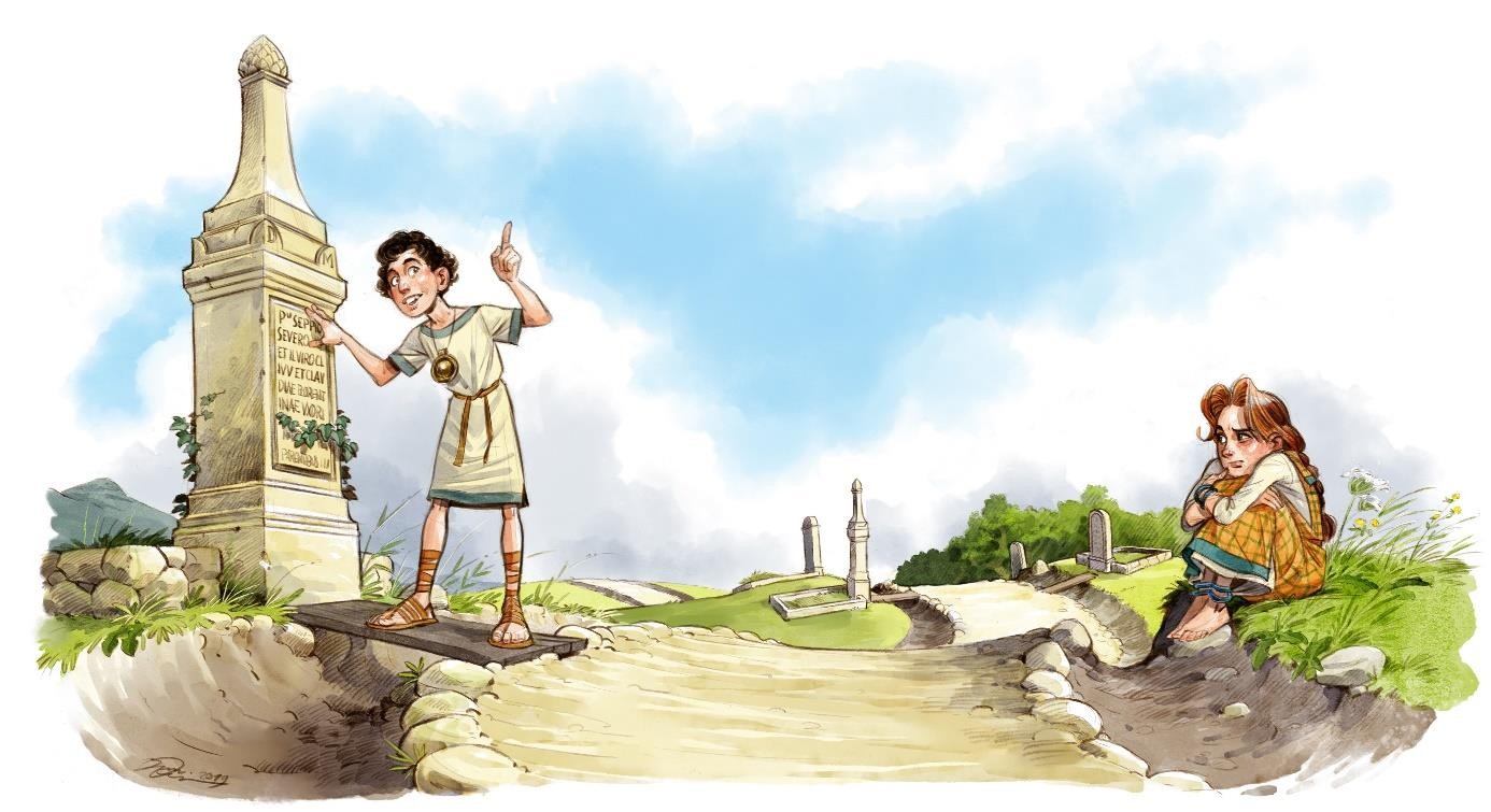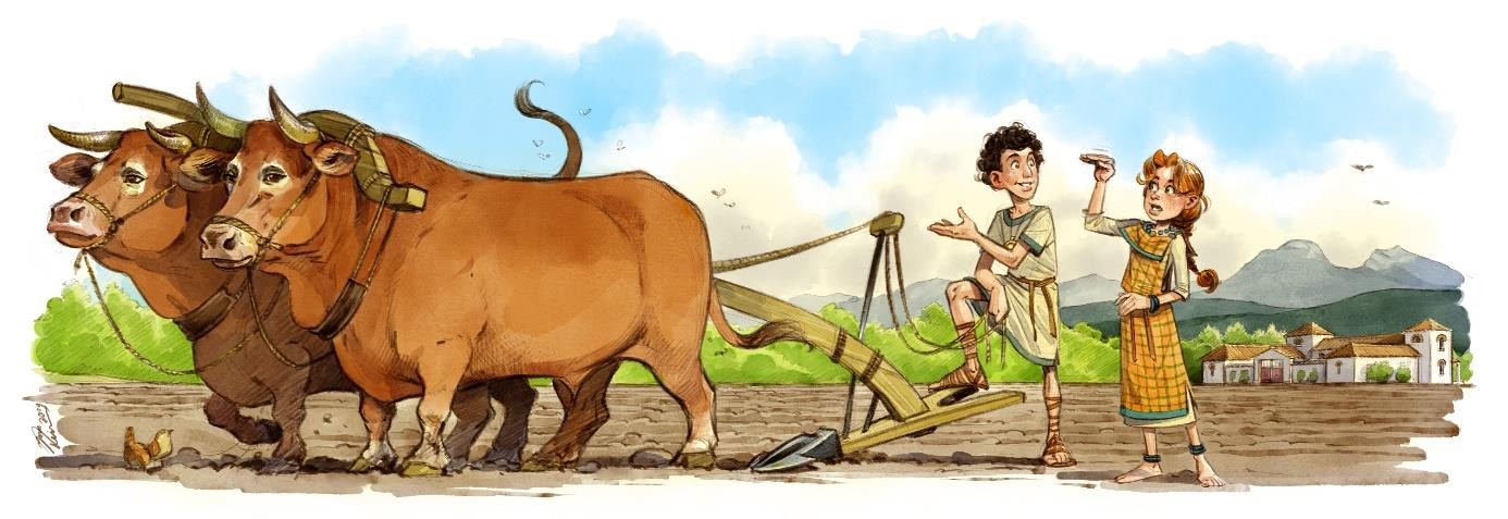 Ein paar Wochen später sehen sich die Kinder wieder. Annilio hat keine Ruhe gegeben, bis sie ihren Vater zum römischen Gutshof begleiten darf. Dort will er von seinem römischen Handelspartner Maultiere für den Transport von Handelswaren kaufen.