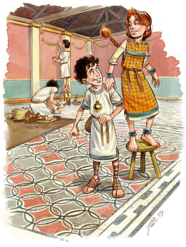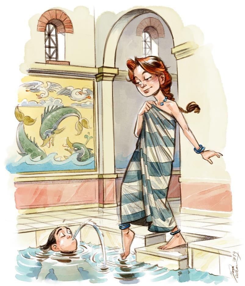 „Schwitzen gehört bei uns zur Reinigung dazu“, erklärt ihr der Junge. „Die Erwachsenen lassen sich auch noch mit Öl einreiben und mit einem Spatel abstreifen.“ Annilio ist ein bisschen schwindlig vor lauter Wärme und Wohlgefühl und sie mag zunächst Marcus gar nicht folgen, als er zu der Tür am anderen Ende des Raumes geht. „Komm, jetzt wird es wieder etwas kühler”, sagt Marcus und öffnet die Tür. „Das ist das Tepidarium, der letzte Raum, hier kannst du dich entspannen.“