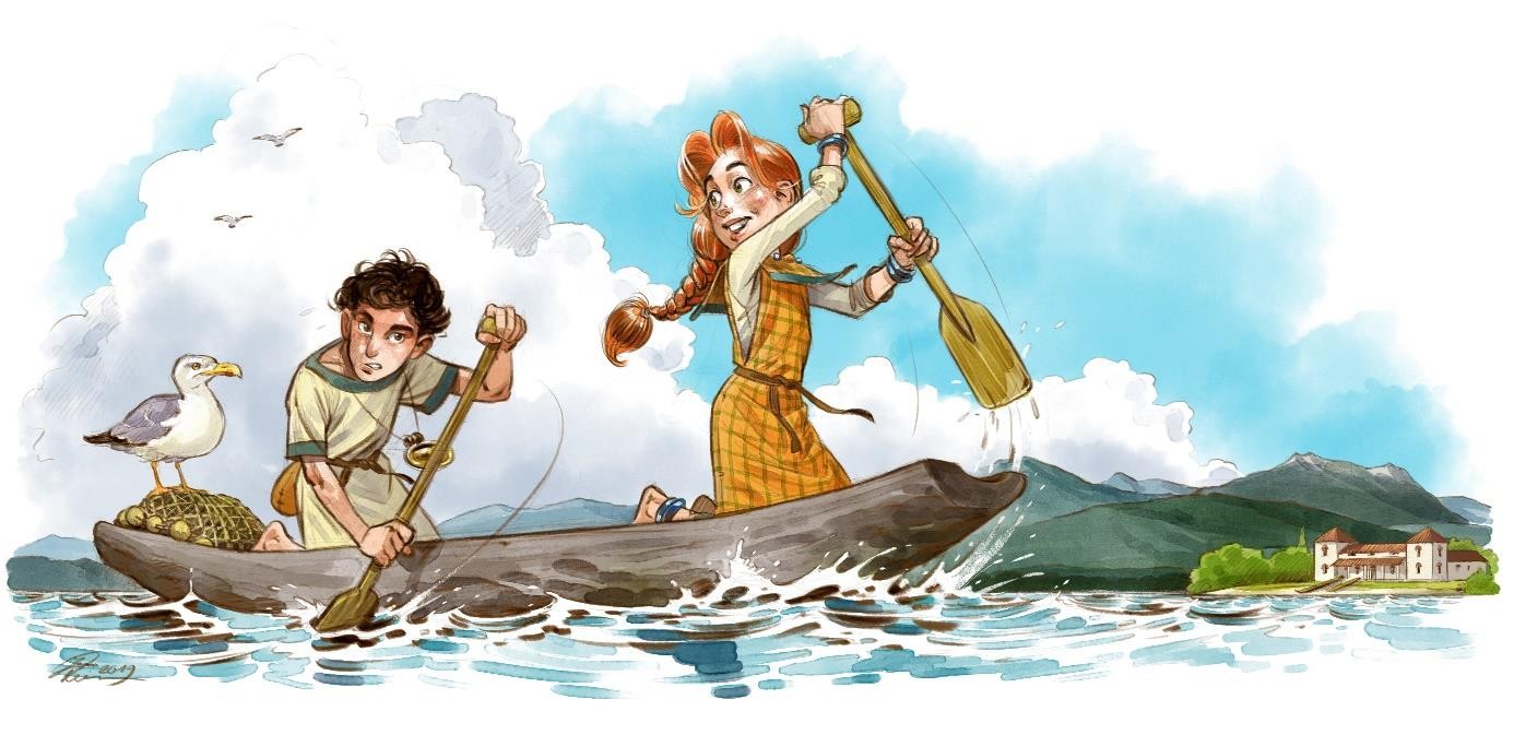 „Natürlich”, grinst Annilio. Der Fischer blickt verdutzt auf das rothaarige vorlaute Mädchen. Als der Knecht dem Fischer ein paar kleine Münzen in die Hand drückt, lässt sich der Fischer überzeugen und hilft den Kindern, das Boot ins Wasser zu schieben. Zwei geschwungene Paddel liegen im Inneren des Einbaums.