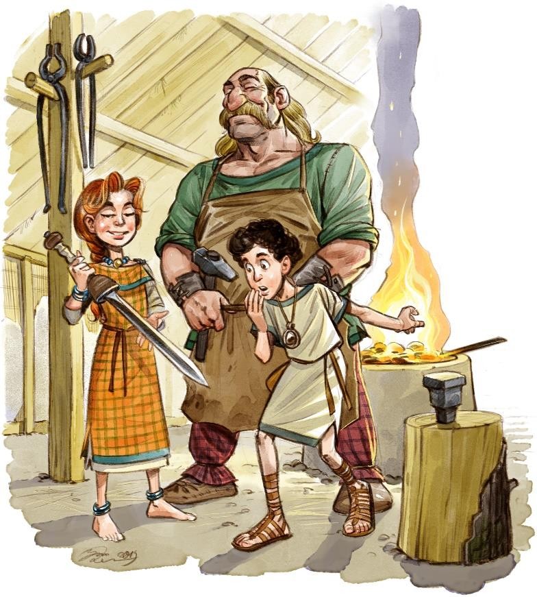 Das Schlagen wird immer lauter, und durch den Rauch sehen sie eine große Gestalt im Feuerschein. Je mehr sie sich nähern, umso heißer wird es. „Ein Riese”, flüstert Marcus Annilio zu, die schon wieder kichern muss. Warum müssen Mädchen immer kichern? Marcus hat Geschichten von den Riesen im Norden gehört, aber bis jetzt ist er noch nie einem leibhaftig begegnet. Bellicius scheint nur aus Muskeln zu bestehen. Mit einem riesigen Hammer schlägt er immer wieder auf ein glühendes Stück Eisen ein, das er mit einer Zange hält. Zwischendurch taucht er das Eisen in Wasser, so dass es zischt und dampft, oder hält es in das Feuer, dann schlägt er wieder mit dem Hammer darauf ein.