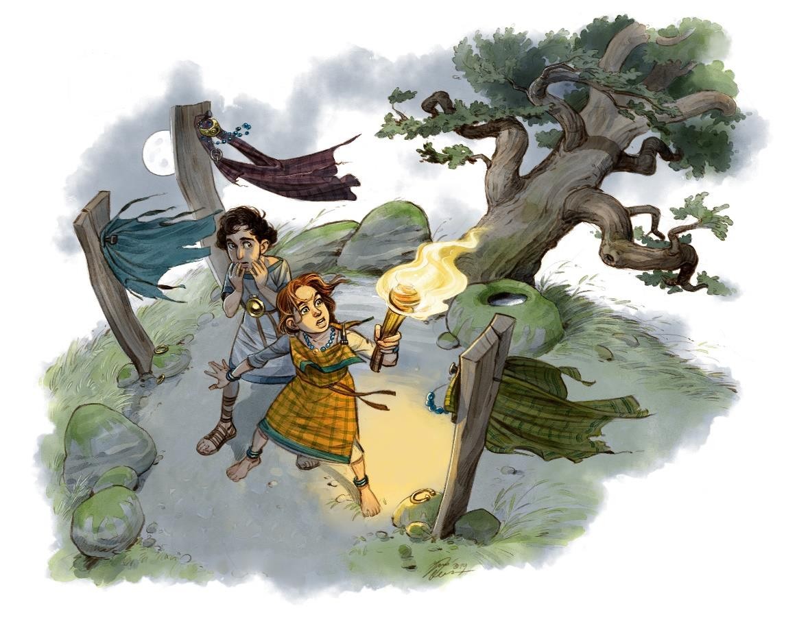 Zwischen den Hütten laufen Hühner herum. Eine Gruppe von Kindern jagt mit lauten Schreien hinter einem kleinen Schwein her. Neugierig mustern die Dorfbewohner die zwei römischen Besucher. Ihr Anführer wohnt in einer großen Hütte in der Mitte des Dorfes. Er begrüßt Marcus‘ Vater wie einen alten Freund. Endlos reden die zwei Männer und trinken dabei Honigwein. Marcus sitzt folgsam dabei und versucht, den Gesprächen aufmerksam zu folgen. Doch nach einer Weile brummt ihm der Kopf und er schaut sich in dem großen Raum um. Da sieht er ein Mädchen, das ihm Zeichen macht. Sein Vater ist so in das Gespräch vertieft, dass er nicht merkt, wie Marcus sich davonstiehlt und dem Mädchen nach draußen folgt. Vor der Hütte wird Marcus mit Fragen überschüttet. Annilio ist die Tochter des Sippenchefs und sie brennt vor Neugierde auf alles, was mit dem römischen Leben zu tun hat. Schon öfter ist sie an dem Gutshof von Marcus‘ Familie vorbeigegangen und hat sich gefragt, wofür die vielen Gebäude da sind. Marcus ist verwirrt: So ein Mädchen hat er noch nie kennengelernt! Seine Schwester Claudia hätte sich nie getraut, einen Jungen aus dem keltischen Dorf mit Fragen zu löchern.