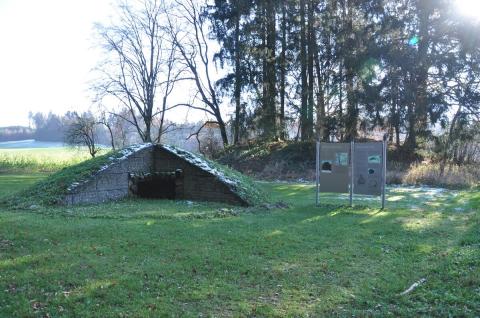 An dieser Station kann der schematische Aufbau eines rekonstruierten Grabhügels der Hallstattzeit besichtigt werden. Ein Fenster ermöglicht den Blick in das Innere bis zur Grabkammer. Schautafeln geben einen guten Überblick über das Bodendenkmal und werden ergänzt durch eine spezielle Kindertafel mit haptischen Elementen.